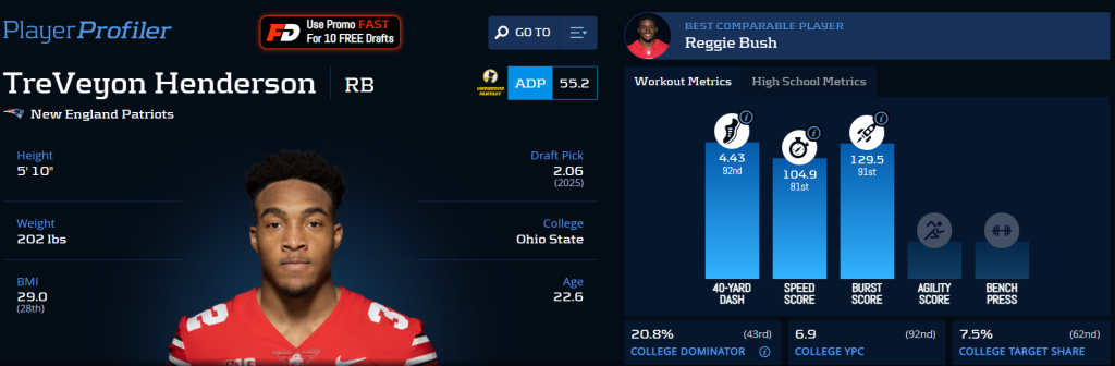 TreVeyon Henderson has long been considered a great prospect. Ever since he burst onto the college scene with over 1,500 total yards and 19 touchdowns as a true freshman at Ohio State, Henderson has been destined for the NFL. With his breakaway running ability and top-notch pass game skills, Henderson has immense potential. Rhamondre Stevenson projects to still have a serious role, though. Henderson is a back who shouldn’t be too overloaded with touches to help keep him healthy and ensure his playmaking explosiveness remains.