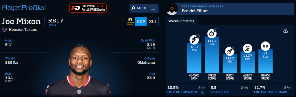 This is Joe Mixon‘s backfield. Nick Chubb is insurance for Mixon. He is familiar with the running scheme the Texans plan to have, and they were lacking depth. Woody Marks can help in the passing game, but he’s not going to take many meaningful touches from Mixon. At his current cost, Mixon is a clear target. He still projects to have a large workload in the Texans’ offense. Even if he continues to have middling efficiency, he’ll be a value.