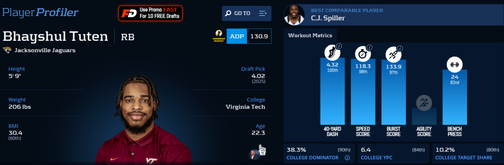 If you looked up “muddy” in the dictionary, you’d find a picture of the Jaguars’ backfield. In 2024, we saw Travis Etienne and Tank Bigsby have clearly defined roles in a near 50/50 split. Bigsby is the clear grinder, and Etienne is the space back and pass catcher. They had some success, but nothing impressive. This offseason brought a new coaching staff with Liam Coen coming to town, who produced one of the productive backfields in 2024 with the Buccaneers. Then, in the NFL Draft, the Jaguars drafted Bhayshul Tuten in the fourth round, who was specifically targeted by the new staff.
