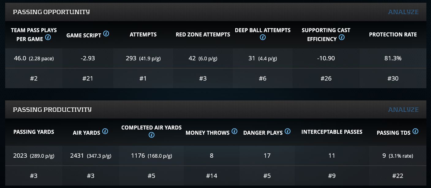 To kick off this week, let’s go back to what worked last week. Russell Wilson and Tyler Lockett melted faces on Sunday night in Week 7. The Let Russ Cook movement in combination with a deteriorating defense has created the perfect storm of fantasy production in Seattle. Russ has been a top 5 QB in four of his six games played and never outside the top ten. His efficiency has been otherworldly as evidenced by his 18 (No. 1 among qualified QBs) Money Throws, +50.2 (No. 1) Production Premium, and 129.1 (No. 1) True Passer Rating.
