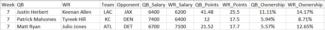 The highlight of Week 7 was the Justin Herbert and Keenan Allen recommendation. They made up the featured stack of the week and delivered monumentally. Both were popular options at above 10-percent ownership, but not the most popular at their positions.