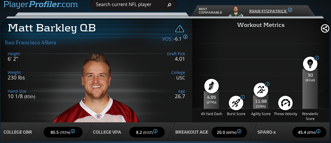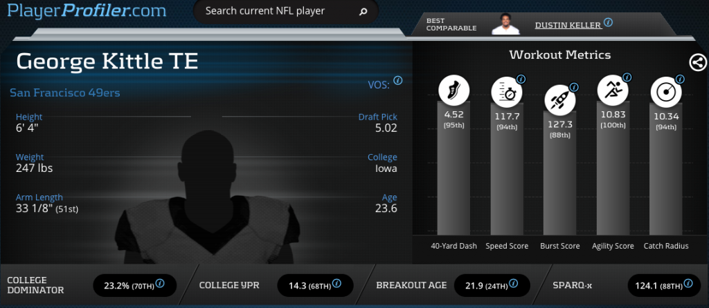 With a 23.2-percent (70th-percentile) College Dominator and 14.3 (68th-percentile) College YPR, George Kittle may not have the name recognition of a David Njoku, O.J. Howard, or Evan Engram, but offers as much potential as any of them. Kittle is also known for being an excellent blocker, which could help him earn playing time sooner rather than later.