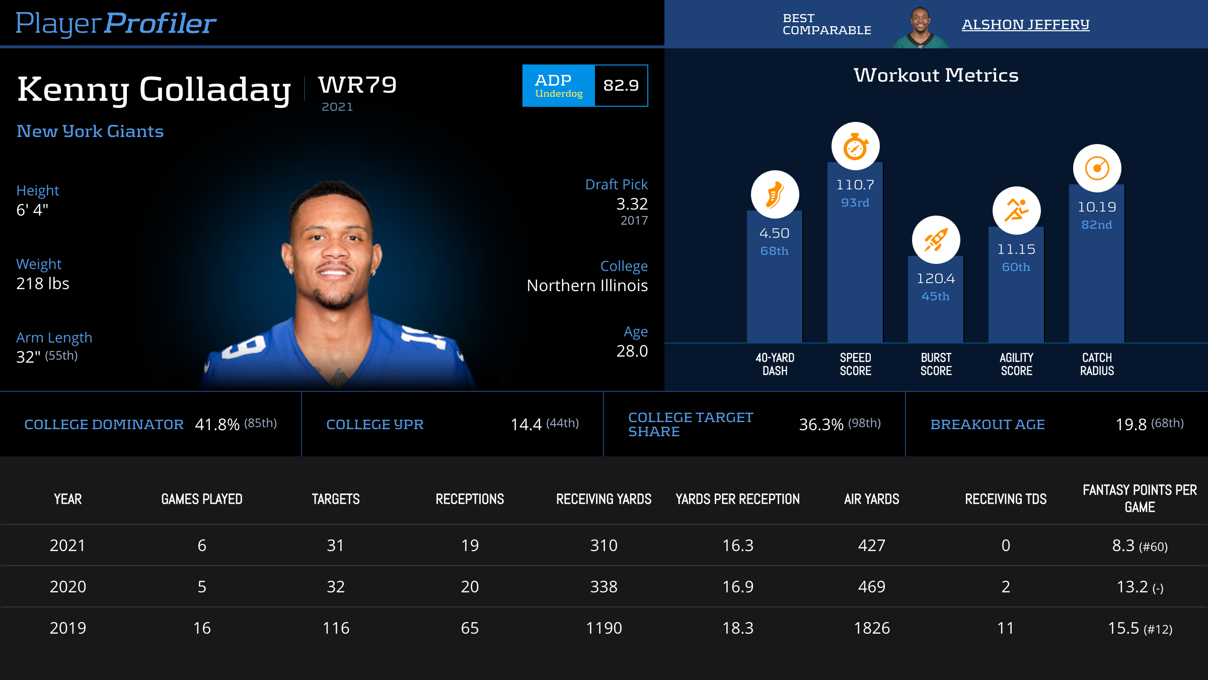 He finished with 477 yards and three touchdowns and averaged 17.0 yards per reception average. Golladay showcased his skill set as a deep ball threat. In Year 2, Golladay finished with 70 receptions, 1,063 yards, and five touchdowns en route to a WR21 finish in half-PPR scoring.