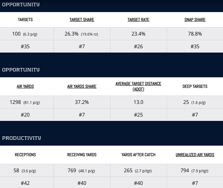We want to focus on advanced statistics and metrics to look at what went right and what didn’t. Analyzing our past mistakes can help us become better fantasy football players. Ultimately, the most important thing is figuring out what each player can do for us this season. This is where it’s crucial to avoid holding grudges and getting too sucked into the whole “what have you done for me lately,” narrative because fantasy managers often have short memories. Let’s start with our stud, Marquise Brown.