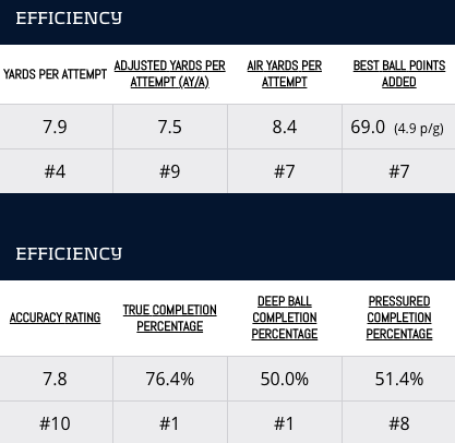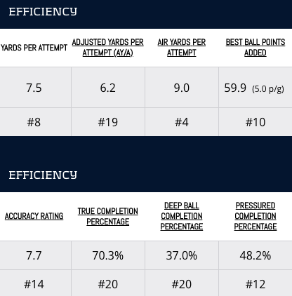 Whereas Murray ranked No. 1 in deep ball completion percentage, Jackson ranked No. 20. Murray had a significant statistical advantage over Jackson in accuracy rating and true completion percentage, as well.