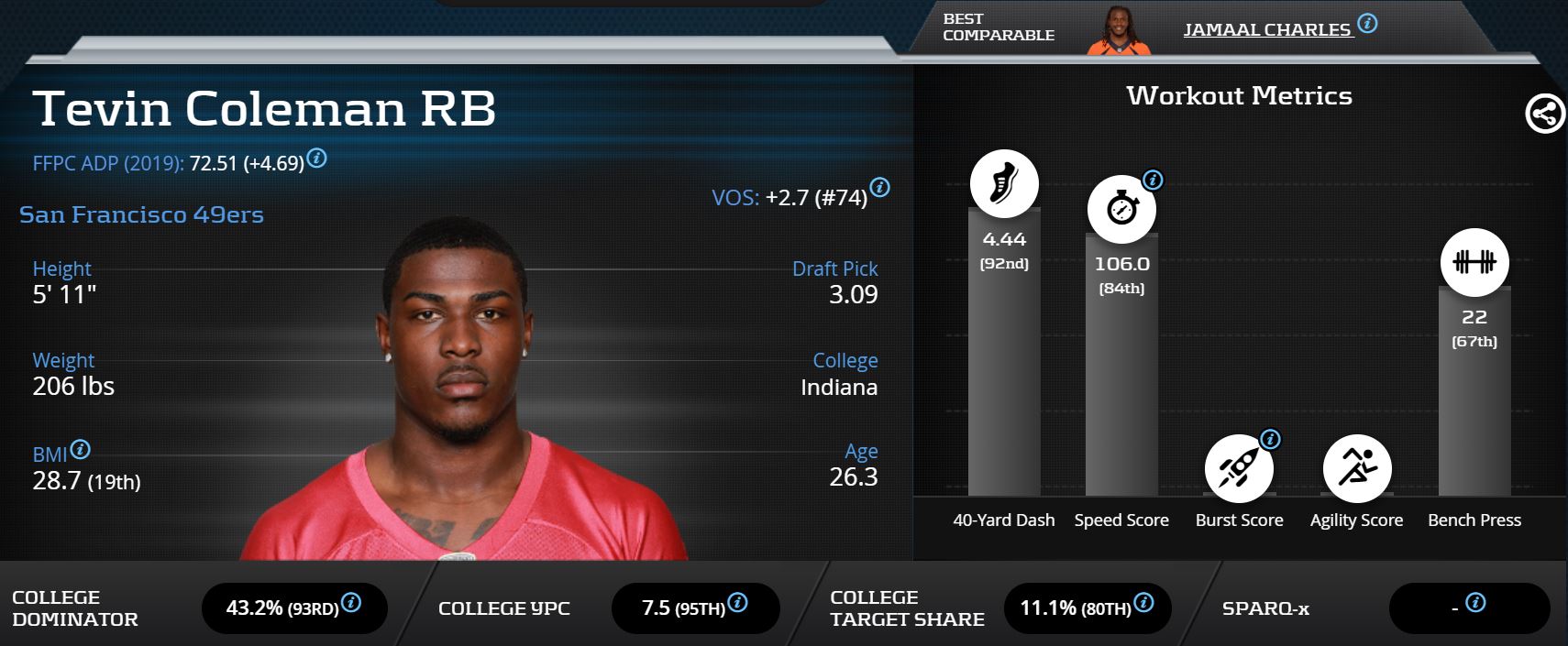 Luckily, the 49ers field an above-average offensive line for Coleman to work with. They provided the battered and bruised Breida with a 91.1 (No. 10) run blocking efficiency rate per Player Profiler. That was with opponents facing off against C.J. Beathard and Nick Mullens for 14 of 17 games. Coleman is the quintessential best ball pick right now. Injuries and preseason work will shed a little light on the backfield opportunity this year. He’ll be worth his mid-round price tag if he takes hold of the opportunity in what projects as a high-octane, efficient offense. It wasn’t that long ago that Shanahan led an MVP-caliber offensive campaign. With Coleman as his hand-picked workhorse, he should rocket up to low-end RB1 status in a hurry.