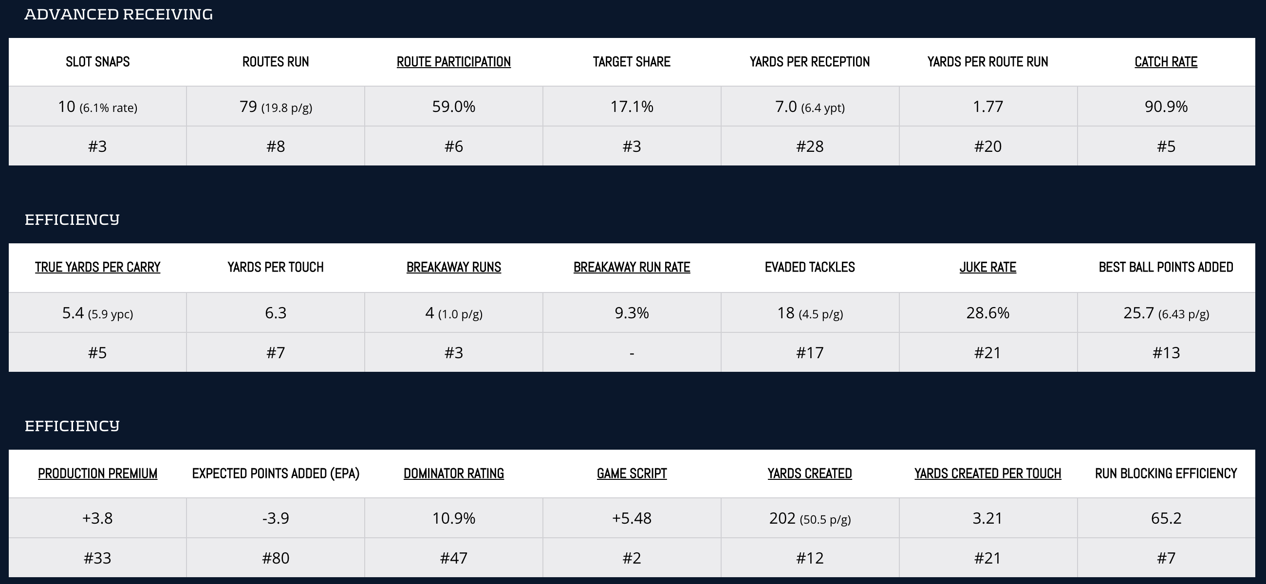 These are promising opportunity and efficiency metrics that lead to production. Denver has shown a consolidated Target Share, which is another big plus. The only negative to watch out for is that Sutton has 496 (No. 3) Air Yards. Air Yards have context, as the Podfather has recently made clear. As a non-separator alpha, these Air Yards are harder to convert from unrealized to completed. Regardless, the talent and opportunity is too salivating to pass up. Go get Sutton before he puts up another 30-point week.