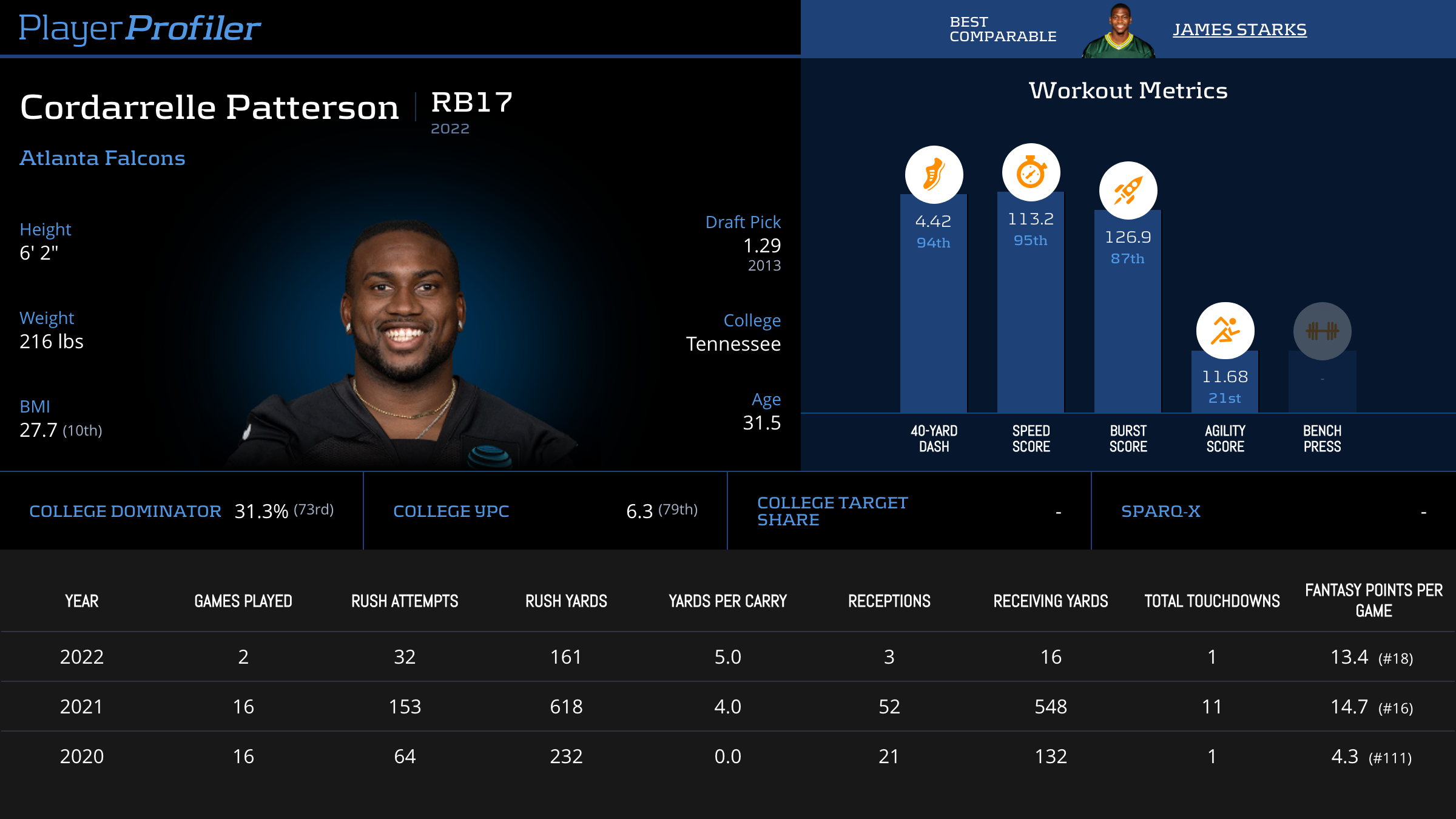Patterson cedes some pass-down work to Avery Williams, but these are the emptiest of empty-calorie snaps. Avery Williams has played 19 snaps the past two week. However, only one featured a carry, and seven featured a route. The rest are primarily spent pass protecting. Last year, Mike Davis handled both between the twenties carries and pass-blocking snaps for Atlanta. It appears his role has been split between Avery Williams and Tyler Allgeier, with Patterson remaining in his 2021 role.