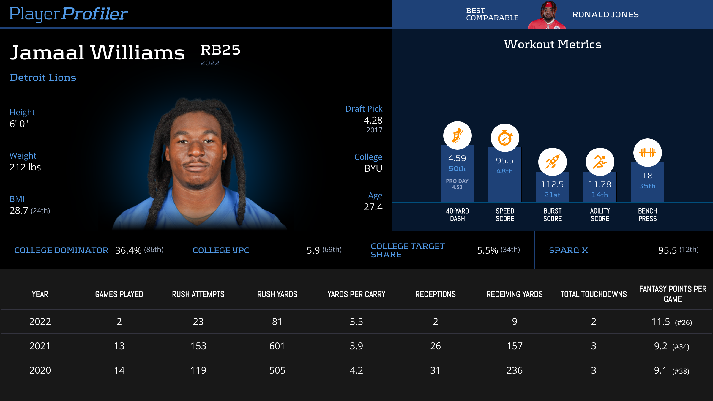 Jamaal Williams is a unique role archetype, and one who has been running pure to start 2022. However, he now may be the feature back for the next two weeks. My question is how much contingent value he truly has. I am somewhat skeptical.