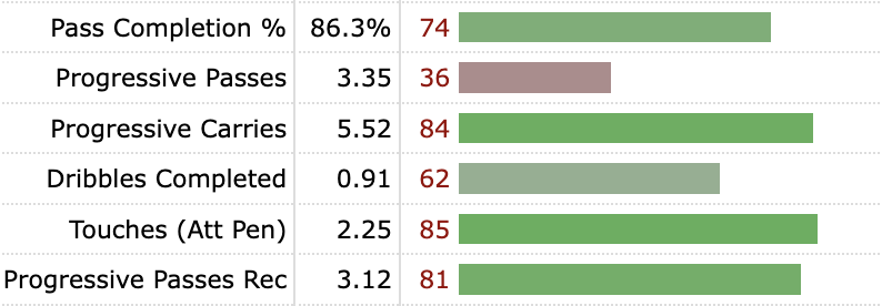 At 5-11, Ramsey is a very good dribbler. In particular, he loves to face his goal, collect the ball, and carry it to the attacking third. Ramsey is in the 84th-percentile when it comes to Progressive Carries per 90 completing 5.51 of them per game. He’s also in the 85th-percentile of carries into the attacking third and carries into the penalty area.