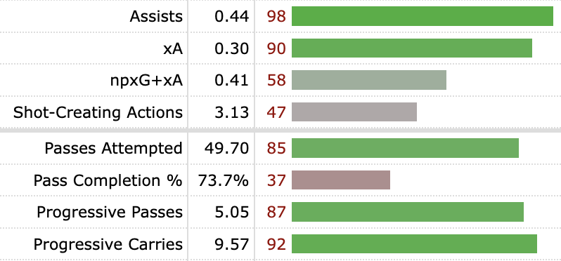 One notable stat is the Olise plays about five progressive passes per 90, which puts him in the 87th-percentile. This gives Palace more creativity to engage the likes of Wilfred Zaha and Odsonne Eduard and Conor Gallagher in attack.