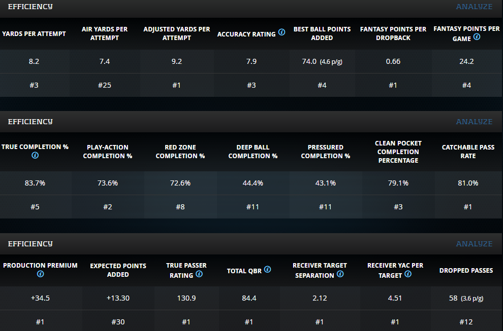 Accuracy is among the most important traits a quarterback can possess. They can be a perfect physical specimen, with the ability to create yards on the ground while having a cannon attached to his shoulders. But if he couldn’t hit the side of a barn door from five yards, his use to a real team, and by definition a fantasy team, is negligible.