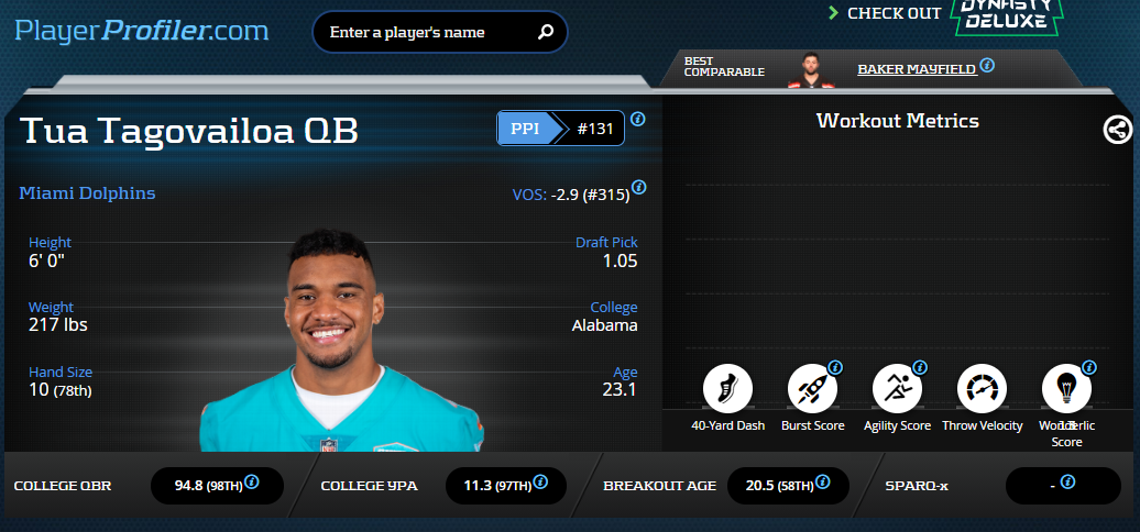 I have gone some way towards establishing the link between an accurate quarterback and an efficient supporting cast. With this in mind, we should have high hopes for Miami Dolphins quarterback Tua Tagovailoa in 2021. He posted a 7.9 Accuracy Rating a year ago, the same as Aaron Rodgers and Teddy Bridgewater. He also delivered a Catchable Pass Rate of 80.3-percent in 2020. Only Rodgers and Drew Brees were better. Yet he managed a dismal 13.8 (No. 28) Fantasy Points per Game. Can we attach some blame to the players around him? With a -7.17 (No. 26) Supporting Cast Efficiency rating, you bet we can.
