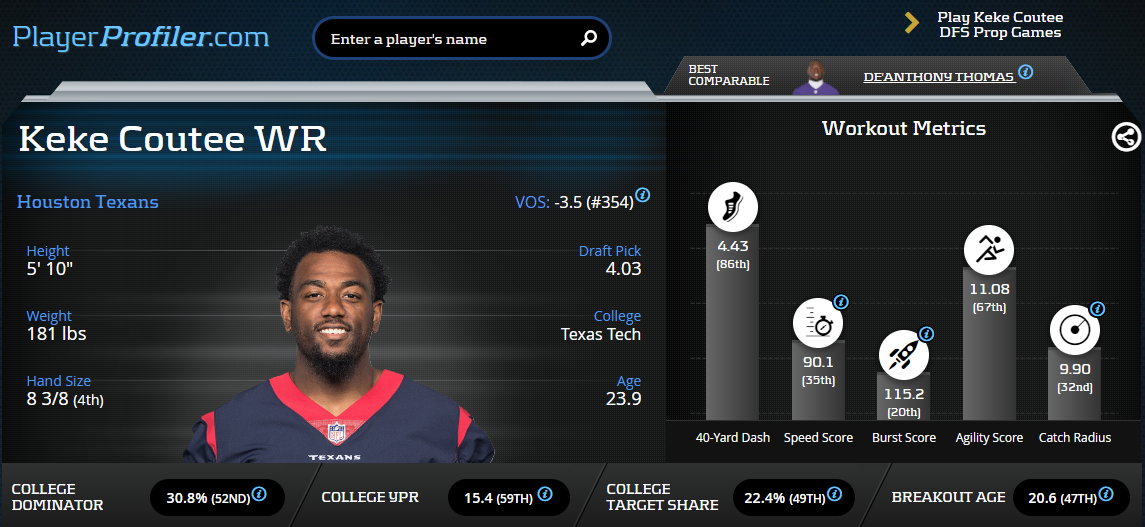 Keke Coutee emerged for a monster performance with 8 catches and 141 yards on 9 targets against the Colts. His increased usage will continue given that he is the secondary option in a high-octane passing game for a Texans offense that continues to project for negative Game Script.