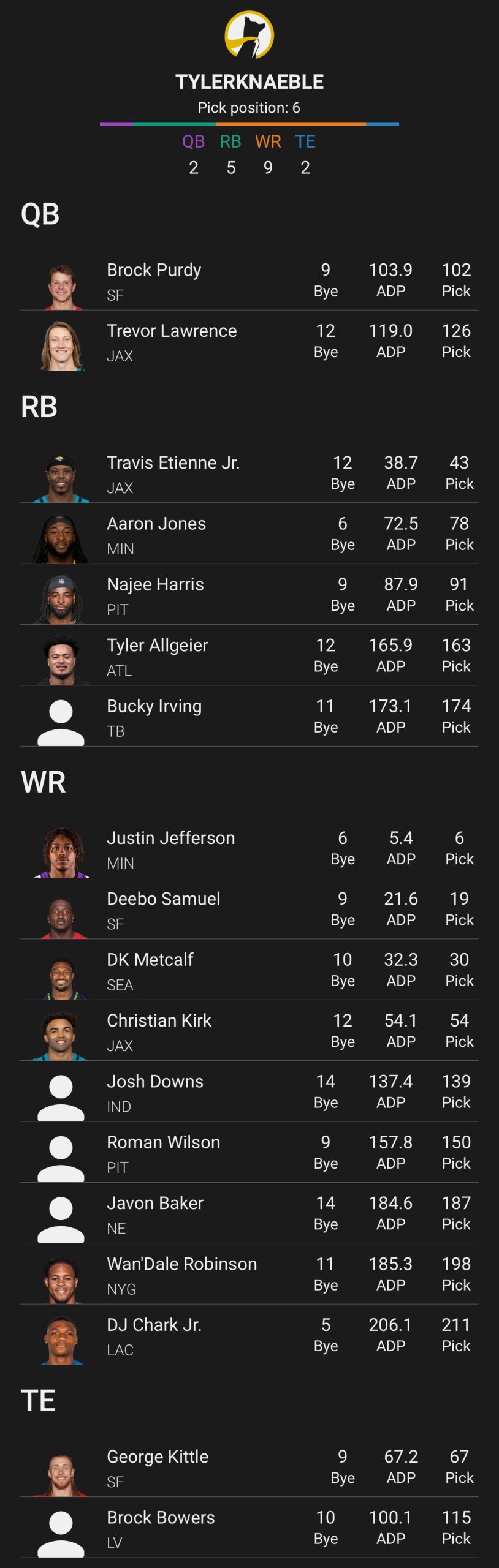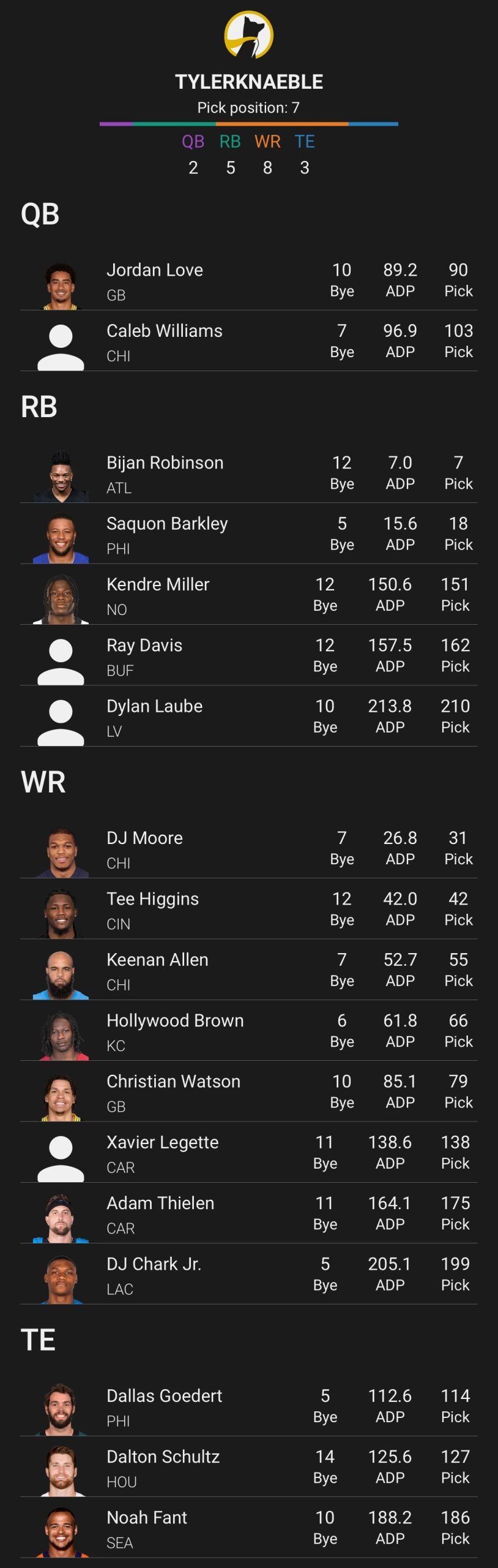 Builds like this are super fun because you can sort of “steal” an extra RB or WR by going early QBs and TEs. I actually got really good value on Bowers in this draft. This allowed me to be done at tight end.