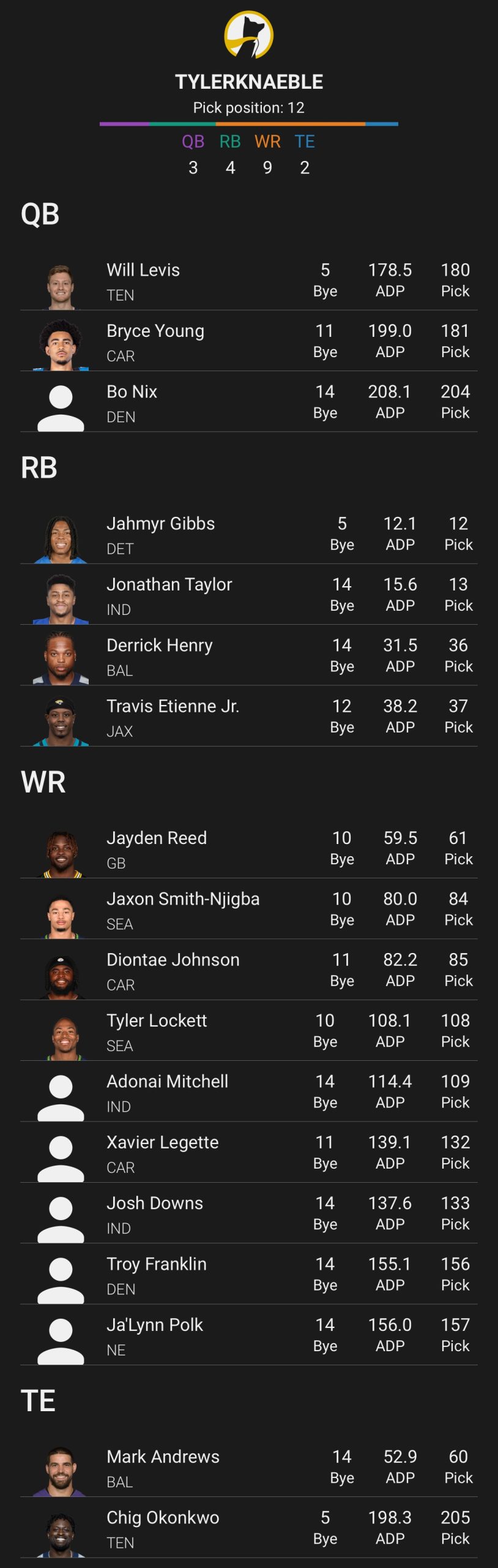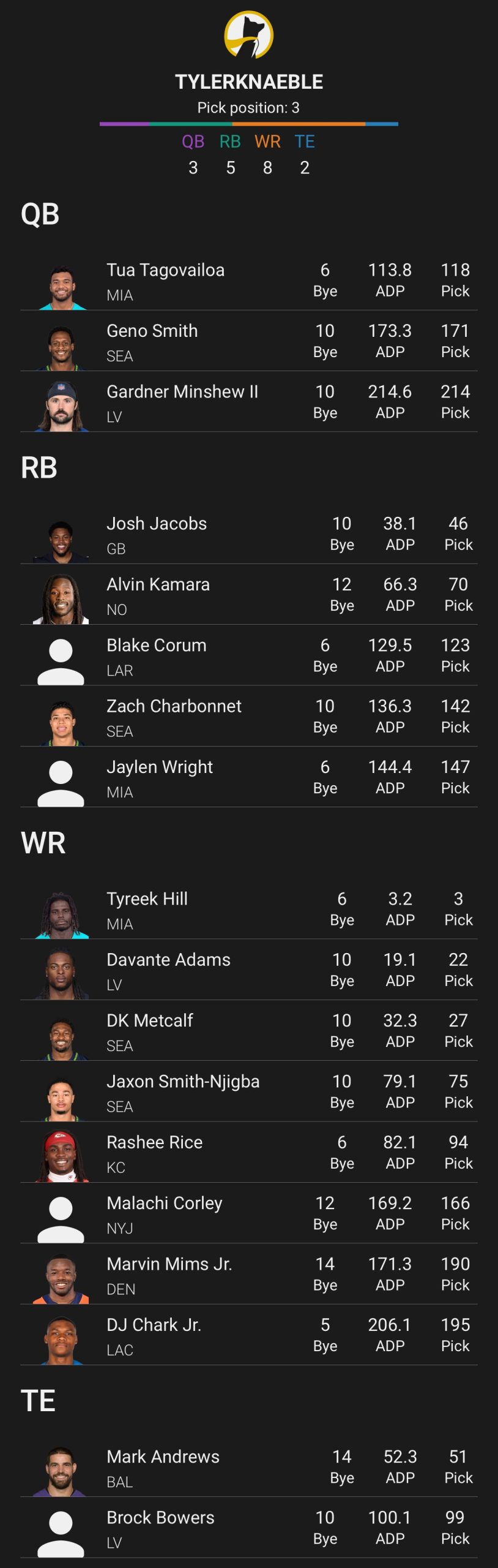 Lastly, I waited on QB because all of my highly drafted WRs like Adams, Hill, and Metcalf all have QBs that go in the middle-late rounds of drafts. Therefore, drafting three guys all after round 10 fit this build.