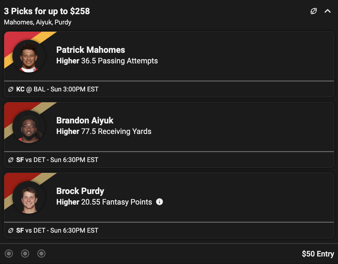 The Lions have been burnt all postseason, just like during the regular season. Matthew Stafford threw for 367 and two TDs. Baker Mayfield threw for 349 and three touchdowns last week. The Lions have continued to run more zone recently, and we have seen Purdy crush zone defenses all season. His passing yards line opened up at 255.5 and has risen to 279.5. We want to take advantage of the game script and the 49ers going to the Super Bowl behind Brock Purdy‘s arm this week.