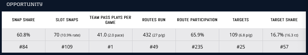Roethlisberger already showed recognition of this fact by frequently targeting Claypool for chunk plays. The rookie had 1,448 (No. 9) Air Yards, 31 (No. 3) Deep Targets, 13 (No. 24) red zone targets, and 11 (No. 5) total touchdowns last year. These aren’t even rate-based metrics, yet he put up these elite peripherals despite playing inconsistently throughout the season because of injury and being a rookie.