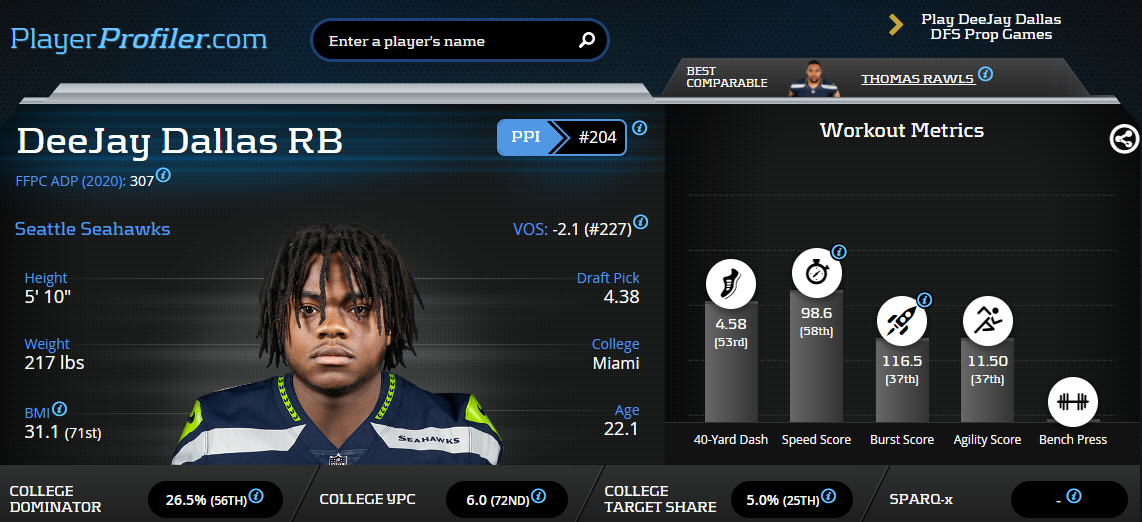 DeeJay Dallas‘ 6.0 (72nd-percentile among qualified running backs) College YPC and Travis Homer‘s 132.2 (94th-percentile) Burst Score (assuming health) make them candidates for significant touches in Chris Carson’s absence. Frankly, Pete Carroll isn’t the type of coach to care about that.