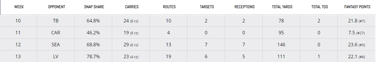 Since the bye week in week 9, the WFT has given the star running back a full workload and the numbers reflect it.
