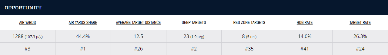 Washington has had injury issues with Logan Thomas and Curtis Samuel and have been unable to rely on them this season, but McLaurin has yet to miss a game, and has a 94.0-percent Snap Share, tops among qualified wide receivers. We all know that the best ability is availability! He is still commanding Deep Targets shown by his league-leading 44.4-percent Air Yards Share. We will see a handful plays made by Terry in this game; if you’re rooting for him, let’s just hope it’s those air yards finally converting into completions down the field. The big plays are coming, so keep him in your fantasy lineups!