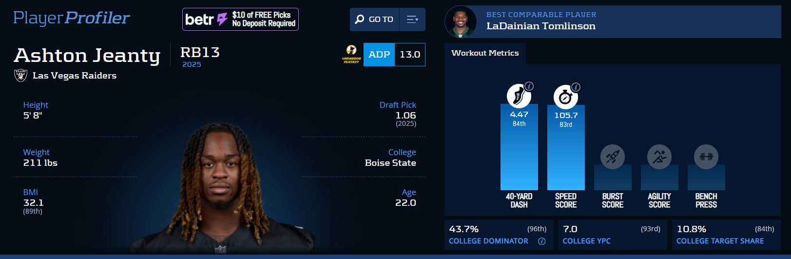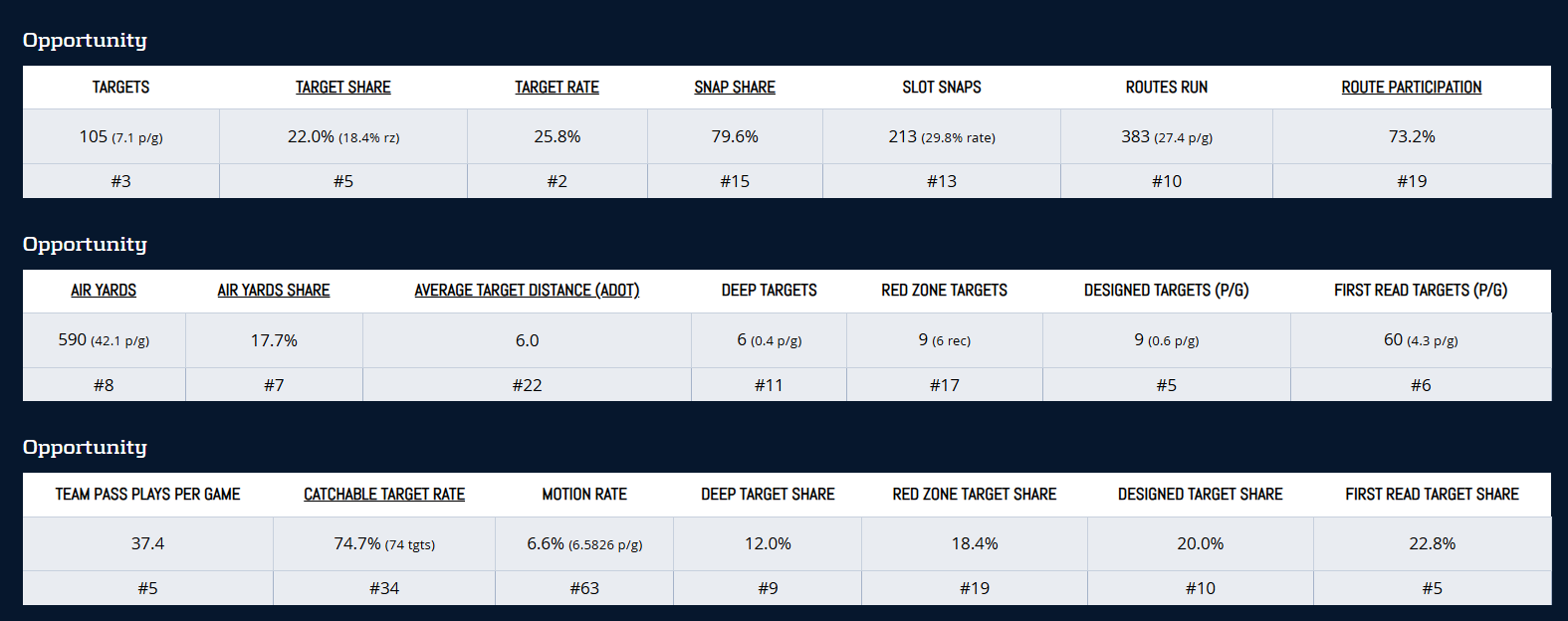 After back-to-back single-digit scoring outputs in Weeks 14 and 15, Ashton Jeanty erupted last week in Houston. The volume has been there. His 31.7% Dominator Rating is fifth in the league. He’s also fourth in evaded tackles and seventh in yards created. The biggest hangup for Jeanty this year has been his offensive line, as evidenced by their 1.5 Run Blocking Rating. Last week, however, against a good defense, Jeanty averaged 5.33 yards per carry and chipped in with 60 yards through the air.