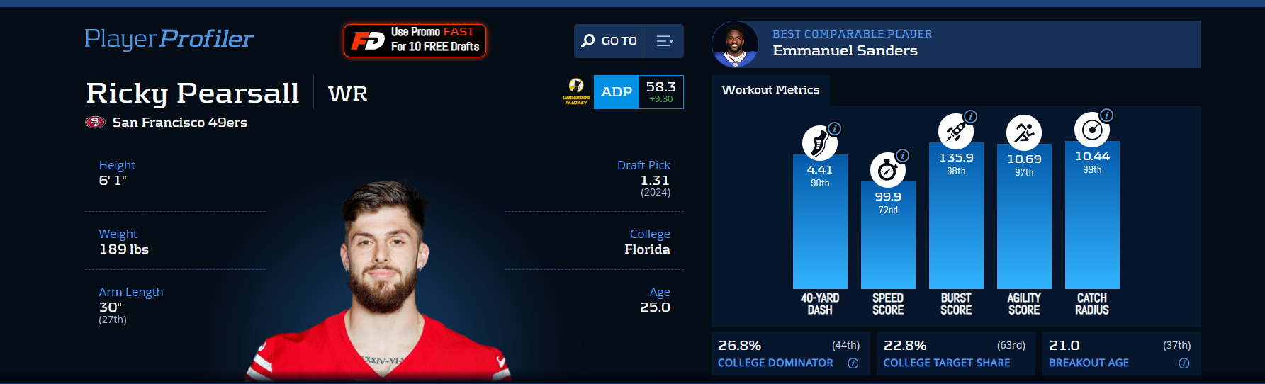 The second-year wideout held his own last week in a tough Week 1 matchup against the Seattle Seahawks. Pearsall hauled in four of seven targets for 108 yards and was one fingertip deflection away from a touchdown.