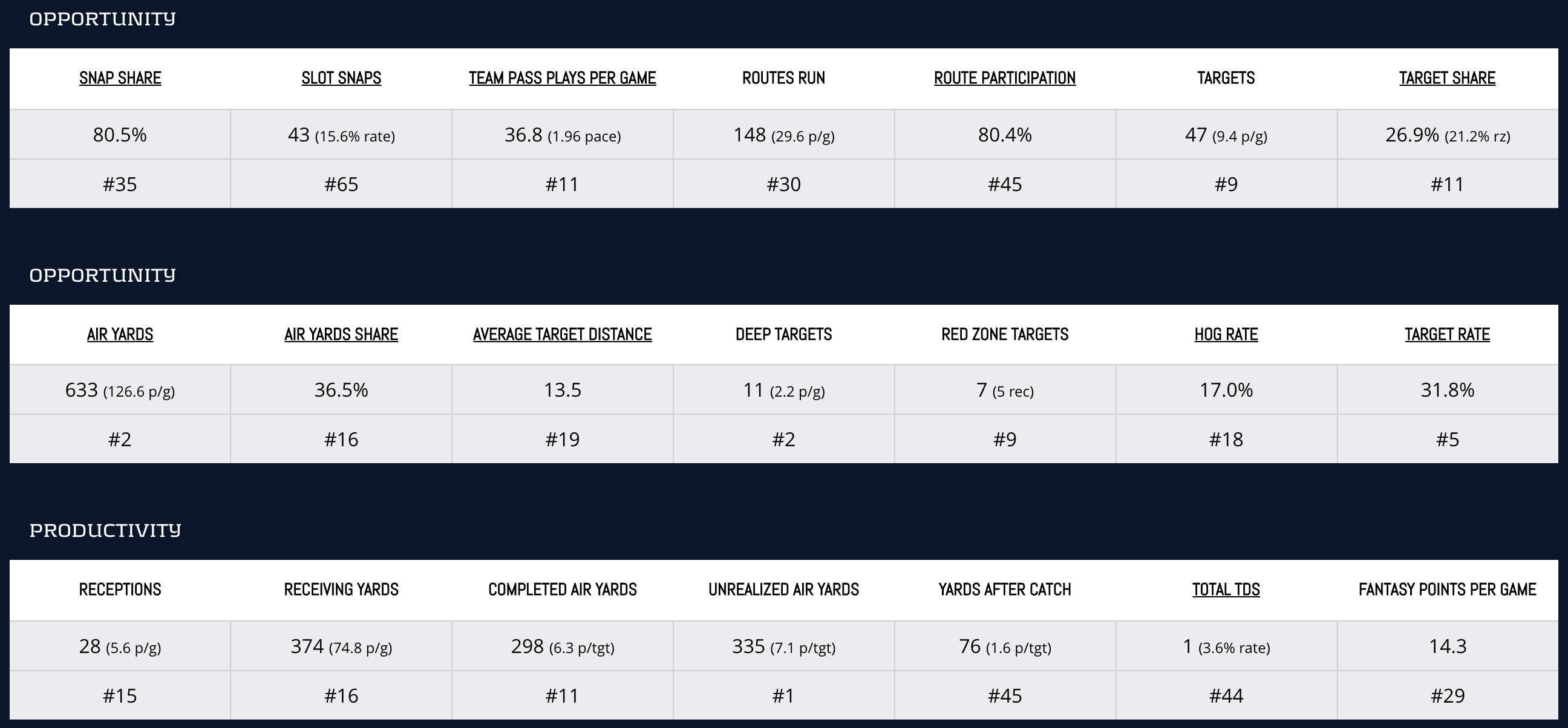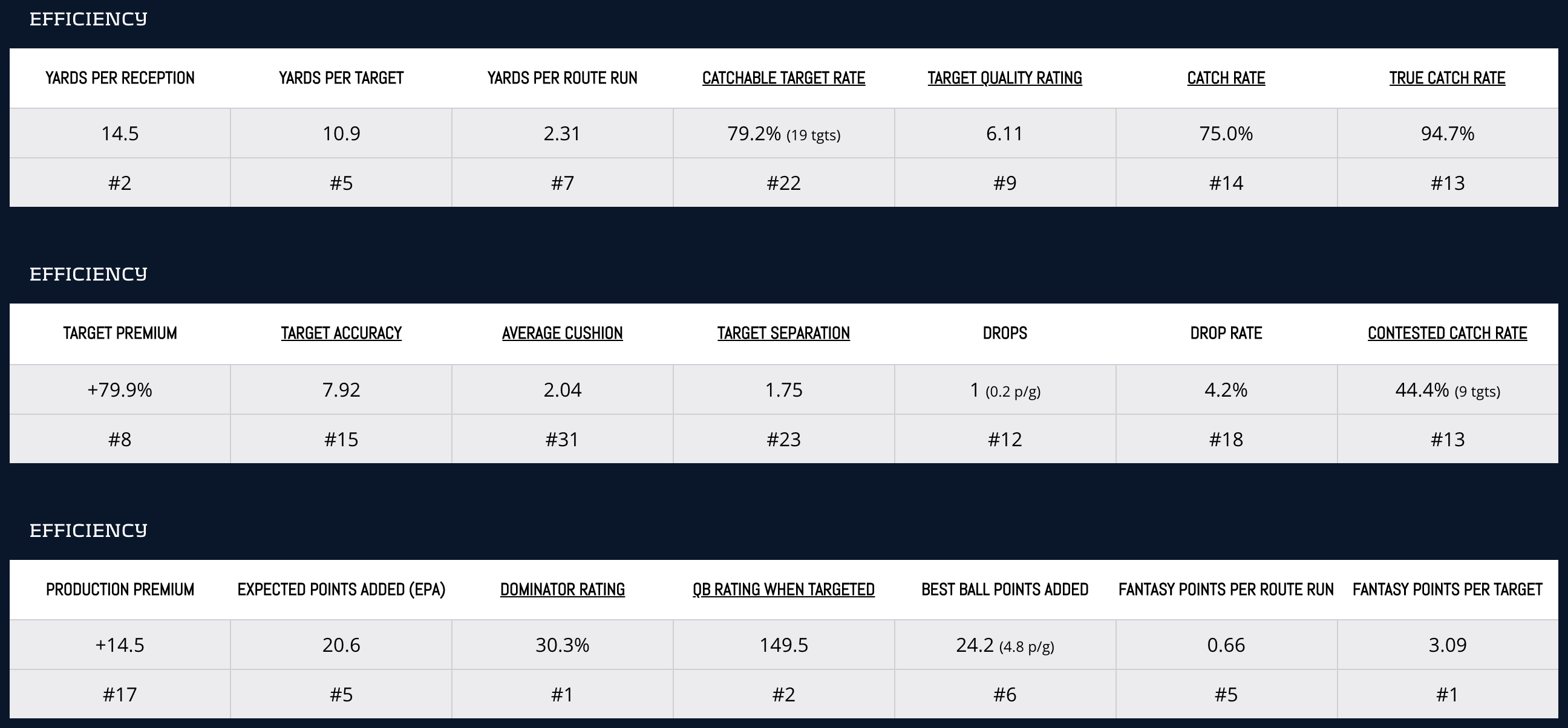 Tonight is the Stefon Diggs breakout game. He’s still a target hog, racking up a 31.8-percent (No. 5) Target Rate and 11 (No. 2) Deep Targets. Allen and Diggs haven’t quite been able to get the connection dialed up to where it was last season. Even though No. 27-ranked cornerback Kristian Fulton is a solid matchup, Diggs has ate versus better corners. This is the game that the buy window closes.