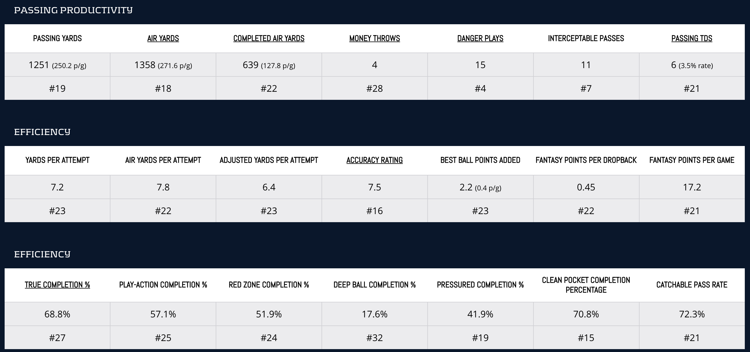 Ryan Tannehill and the Tennessee Titans have struggled this season. Tannehill has eclipsed 300 yards just once, and has posted a dismal 75.8 (No. 23) True Passer Rating en route to 17.2 (N0. 21) Fantasy Points Per Game. This is a tough spot for a rebound game, going up against the league’s best defense versus quarterbacks. Tannehill is worth starting only in 2QB/Superflex leagues.