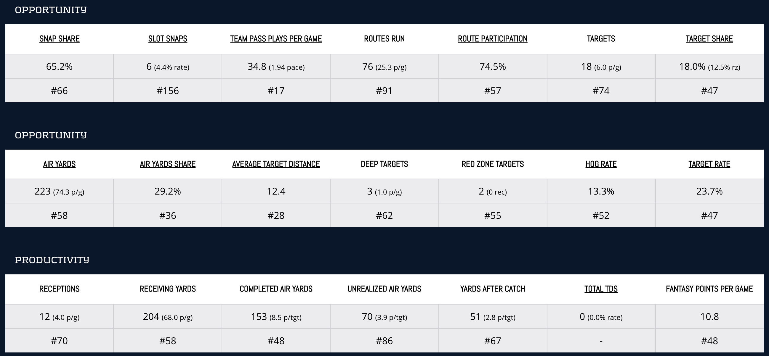 Besides one boom week, Cole Beasley has been quiet this season. With Sanders’ arrival, Beasley has been pushed down to the “irrelevant” zone. His low Target Share and -33.1 (No. 147) Target Premium renders him unreliable in all formats.
