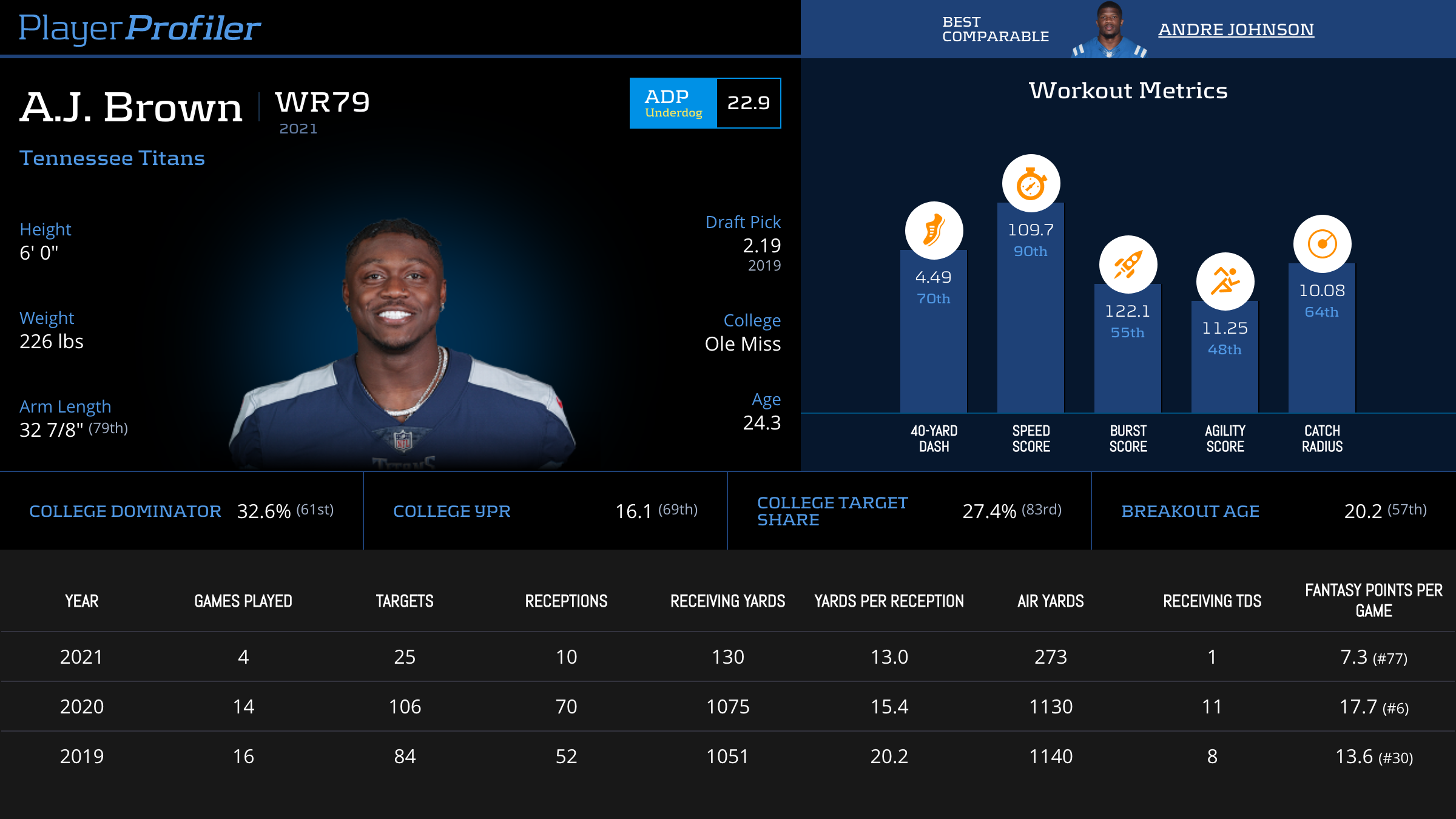 The late questionable tag on A.J. Brown means nothing. He’ll be out there tomorrow night, and hopes to have his first productive game of the season. The talent and opportunity are there, they just haven’t translated to production yet. Brown ran a route on every single Titans pass attempt last week, and we can expect the same tonight. That being said, he faces No. 6-ranked CB Tre’Davious White, and hasn’t been reliable enough to trust in starting lineups unless you need a Flex.