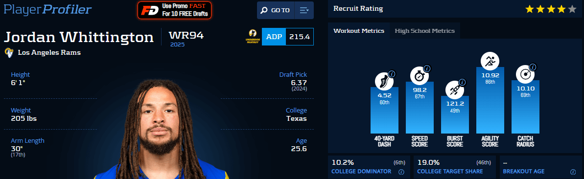 Whittington has already had a minor role in the Rams’ passing attack this season (13 targets, 10 receptions, and 112 receiving yards in five games). However, his role increased greatly in 2024 when Nacua wasn’t on the field. During those games, Whittington averaged 5.4 targets, 4.2 receptions, and 57.4 receiving yards to go with 10.2 PPR points per game.