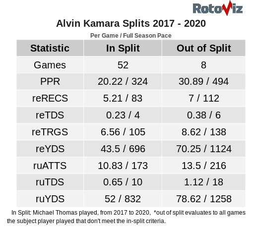 The most important beneficiary of this loss is not listed at wide receiver. It’s Alvin Kamara. The same research by Santiago Casanova mentioned above found that running back targets are more scripted (based on QB and coach) than earned. The splits for Kamara with and without Michael Thomas support this claim. He already earns a solid Target Share to begin with, but without Thomas, he was virtually force-fed.