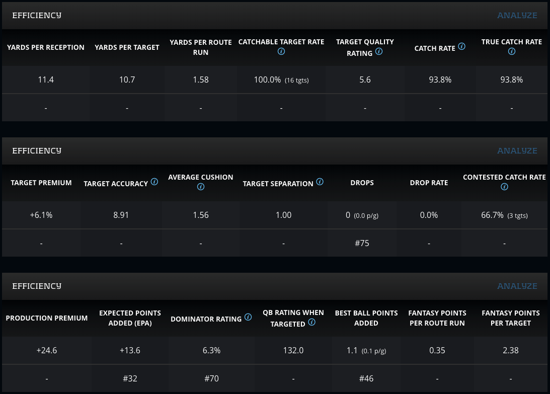 The Underworld has been toutin’ Trautman (editors note: I’ll allow it, but barely) for quite some time. Best Comparable to Dallas Goedert and Captain America, he’s not just any tight end; he’s America’s tight end. With an 11.05 (95th-percentile among qualified tight ends) Agility Score and a 38.1-percent (97th-percentile) College Dominator Rating, Adam Trautman has proved he has the frame and the talent to corral targets at a mind-melting pace in college, and his rookie season efficiency screams “breakout candidate.” He displayed reliability with his 93.8-percent True Catch Rate, 132.0 QB Rating When Targeted, and +24.6-percent Production Premium. To go with that, his +6.1-percent Target Premium and 2.38 Fantasy Points Per Target (No. 2 out of all tight ends if he would’ve qualified) indicates that when he did receive targets, they were fantasy-friendly targets that turned to fantasy-relevant production.