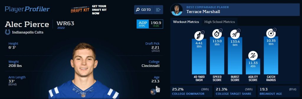 Pierce is a downfield weapon who boasts elite athleticism. He is 90th-perentile or better in all PlayerProfiler Workout Metrics besides Agility Score. And Richardson, who possesses elite arm talent, will be throwing him the ball. It’s no guarantee Michael Pittman will be Richardson’s favorite target. If Shane Steichen makes the Colts’ offense anything like the Eagles’, he will consolidate the targets heavily to his best receivers. Select Pierce late on the hopes he can establish a connection with the rookie QB.