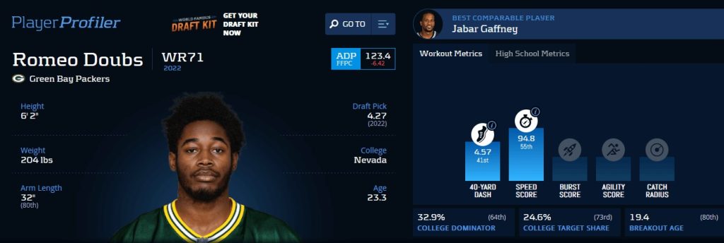 Doubs has the size to succeed outside, however, at 6-2 and 200-pounds. His 94.8 (55th-percentile) Height-Adjusted Speed Score is above average. His collegiate production metrics are outstanding as well. Doubs’s 32.9-percent (64th-percentile) College Dominator Rating, 24.6-percent (73rd-percentile) College Target Share, and 19.4 (80th-percentile) Breakout Age are all impressive predictive metrics. It should be noted that he shared a field with Cole Turner in college, who could be the starting tight end for the Washington Commanders this season. His lack of late-season production in 2022 can be attributed to a high ankle sprain he suffered in Week 9. If Love can produce, Doubs has a good chance to outperform his round 10 ADP.