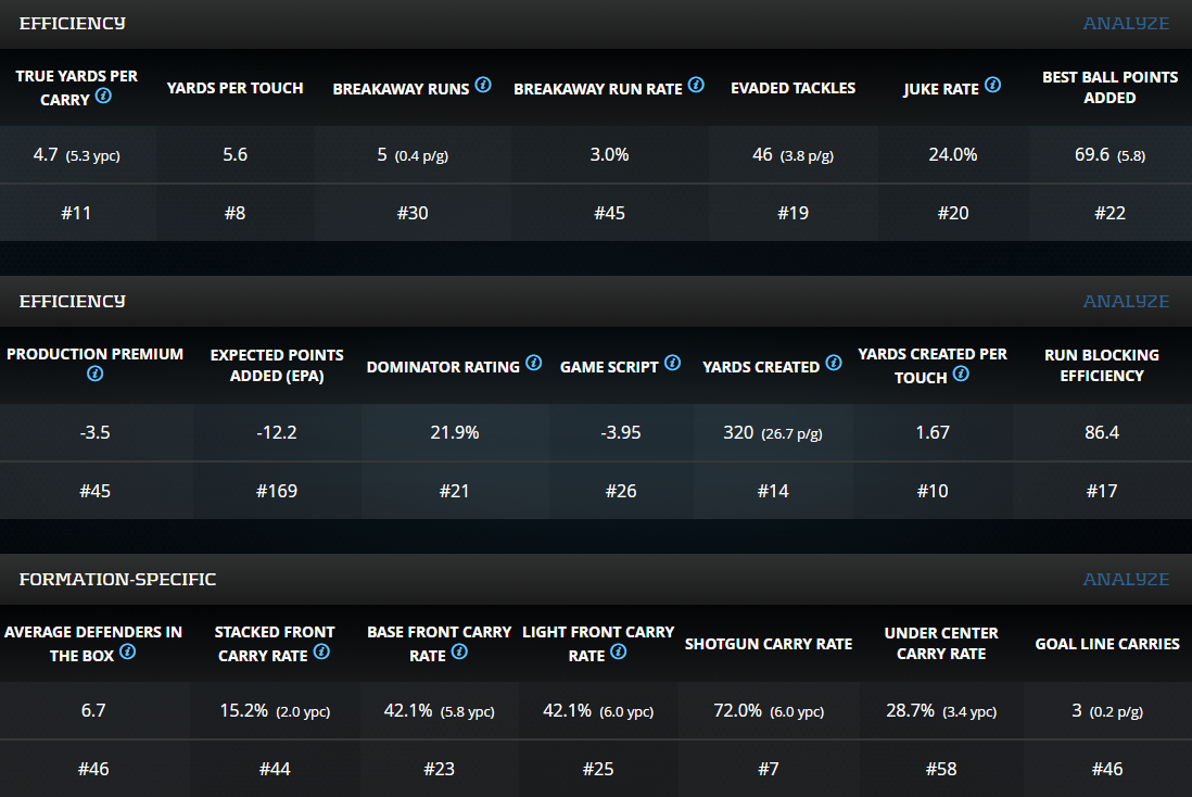 When picking towards the back of the first round, all the surefire bellcow backs are gone. At this point, you have really two options: embrace a zero RB approach or take who you perceive to be the best players available regardless of position. When there is a running back whose increased offensive role I have a strong conviction about, I usually lean towards the ‘best player available’ strategy. For me, Miles Sanders, was one of those running backs. It turned out that this hunch was right. He was provided a 77.0-percent (No. 3) Snap Share and a 76.3-percent (No. 6) Opportunity Share, clearly receiving bellcow usage. He was also efficient with his usage, averaging 5.6 (No. 8) Yards per Touch and 1.67 (No. 10) Yards Created per Touch.
