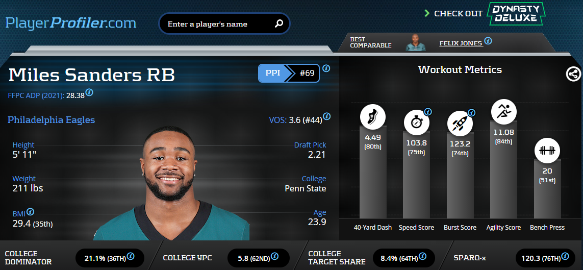 I was a big fan of Miles Sanders as a prospect and drafted him in many leagues in his rookie season. His 120.3 (76th-percentile) SPARQ-x score, above-average 8.4-percent (64th-percentile) College Target Share, and 211-pound frame fits the profile of an every-down workhorse.
