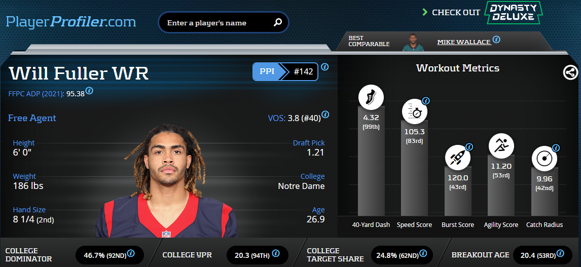 I’ve always been a fan of Fuller and his week-winning upside. His 4.32 (99th-percentile) 40-yard Dash speed makes him one of the fastest players in the NFL. His utilization in the Texans offense prior to 2020 made him a candidate for boom weeks. However, his injury history and sporadic production behind DeAndre Hopkins made him frustrating to roster for many.