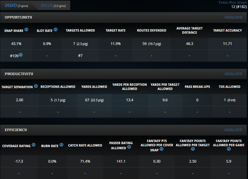 Sidney Jones has started the last three games for the Jacksonville Jaguars and the results have been mixed. In Week 6, he allowed seven receptions for 114 yards on 10 targets. He had his best performance the week before that, allowing two receptions for 12 yards on six targets as Fuller’s primary coverage. Jones’ sample size is too small for his stats to qualify among cornerbacks, but his 14.5 Yards Per Reception Allowed is a problematic stat when matching up with a deep threat such as Fuller.