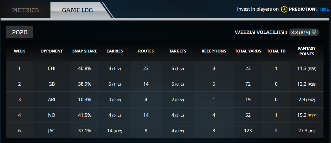 The offseason addition of Jimmy Graham has allowed the Bears to ease the 21-year old into the pros. On the season, Kmet has a 32.1-percent (No. 69) Snap Share and has drawn five (No. 63) targets. Last week, he ran seven routes, catching both of his season-high two targets. The athletic tight end scored his first career touchdown on Sunday. Look for Kmet’s role to increase as the season moves along. Monitor his usage. Those in need of future TE production should find a way to stash him in dynasty formats.