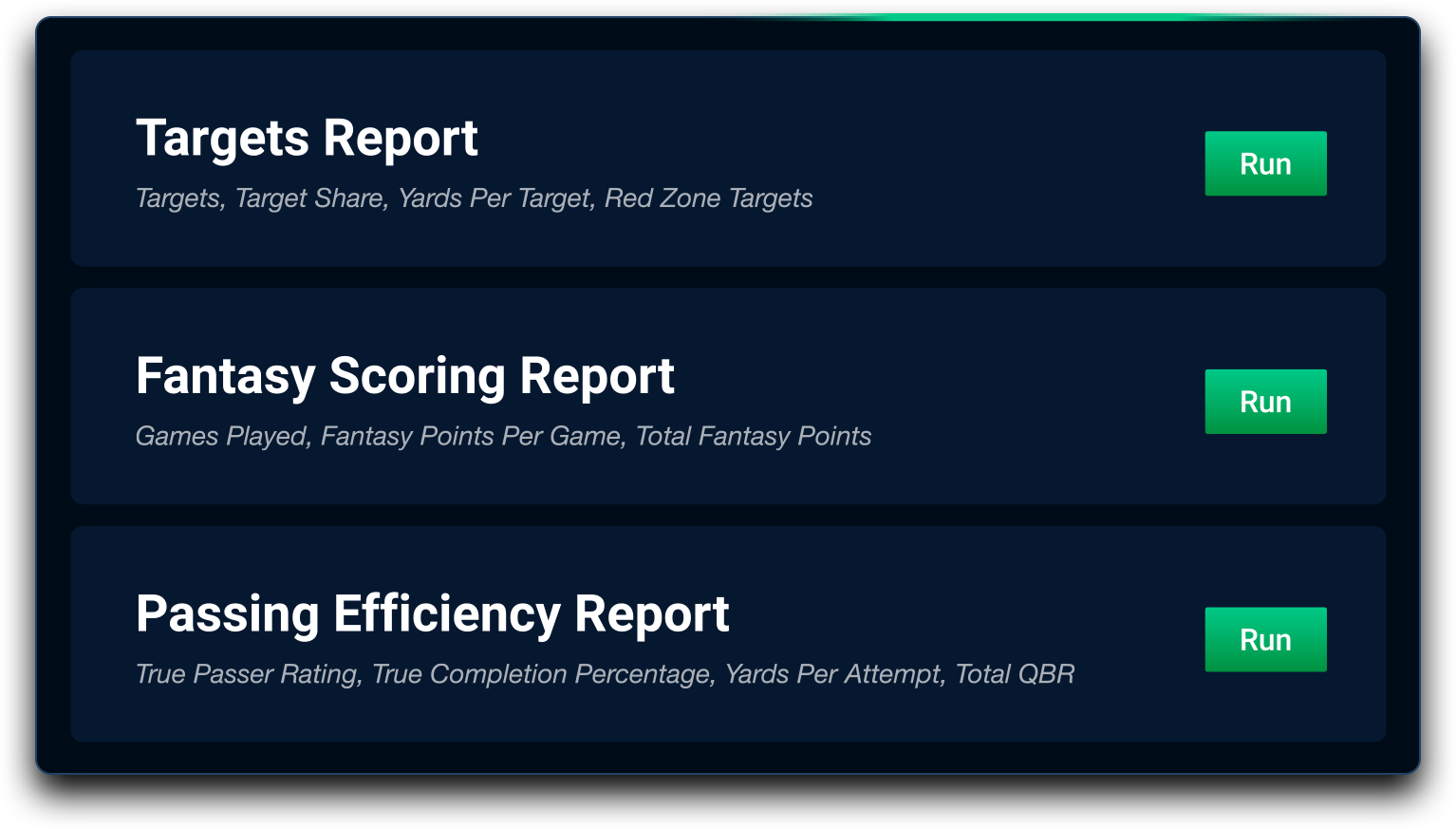 We've made it easy for every user to analyze the most high-value stats in seconds for receiving, rushing, passing, defense, and fantasy scoring.