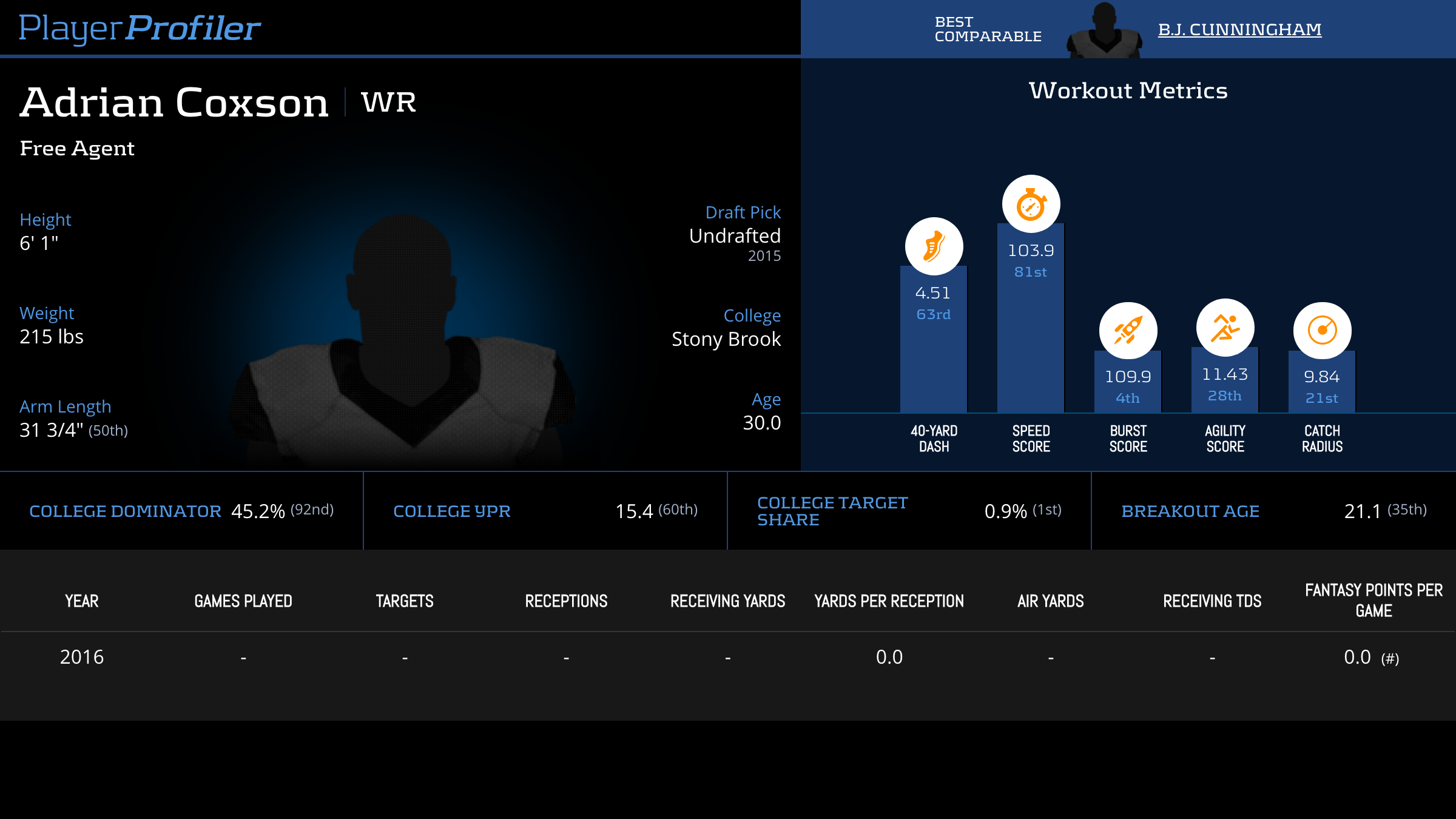 | Year Year | Games Games | Receptions Recs | Receiving Yards Rec Yds | Target Share Tgt Share | Catch Rate Catch Rate | Receiving Touchdowns Rec TDs | Special Teams Yards Special Teams | Age Age | School School |