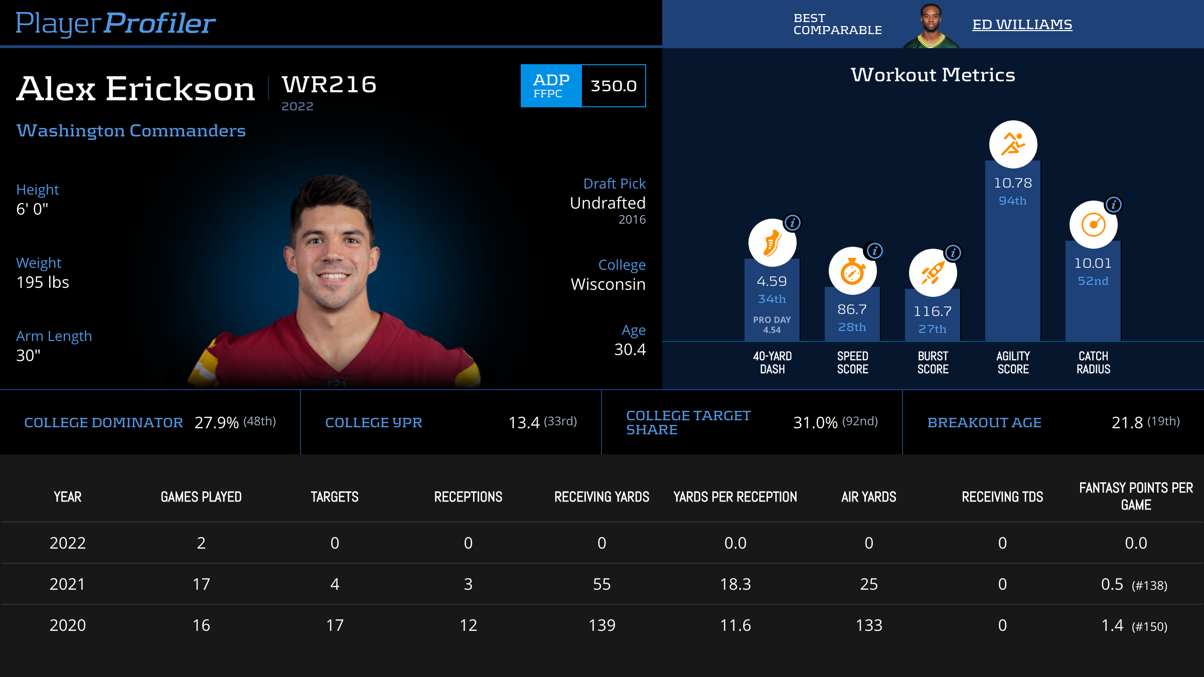 Box score statistics such as targets, yards, touchdowns, and fantasy points per target are updated the next day. Advanced stats and metrics are updated later in the week during the NFL season.