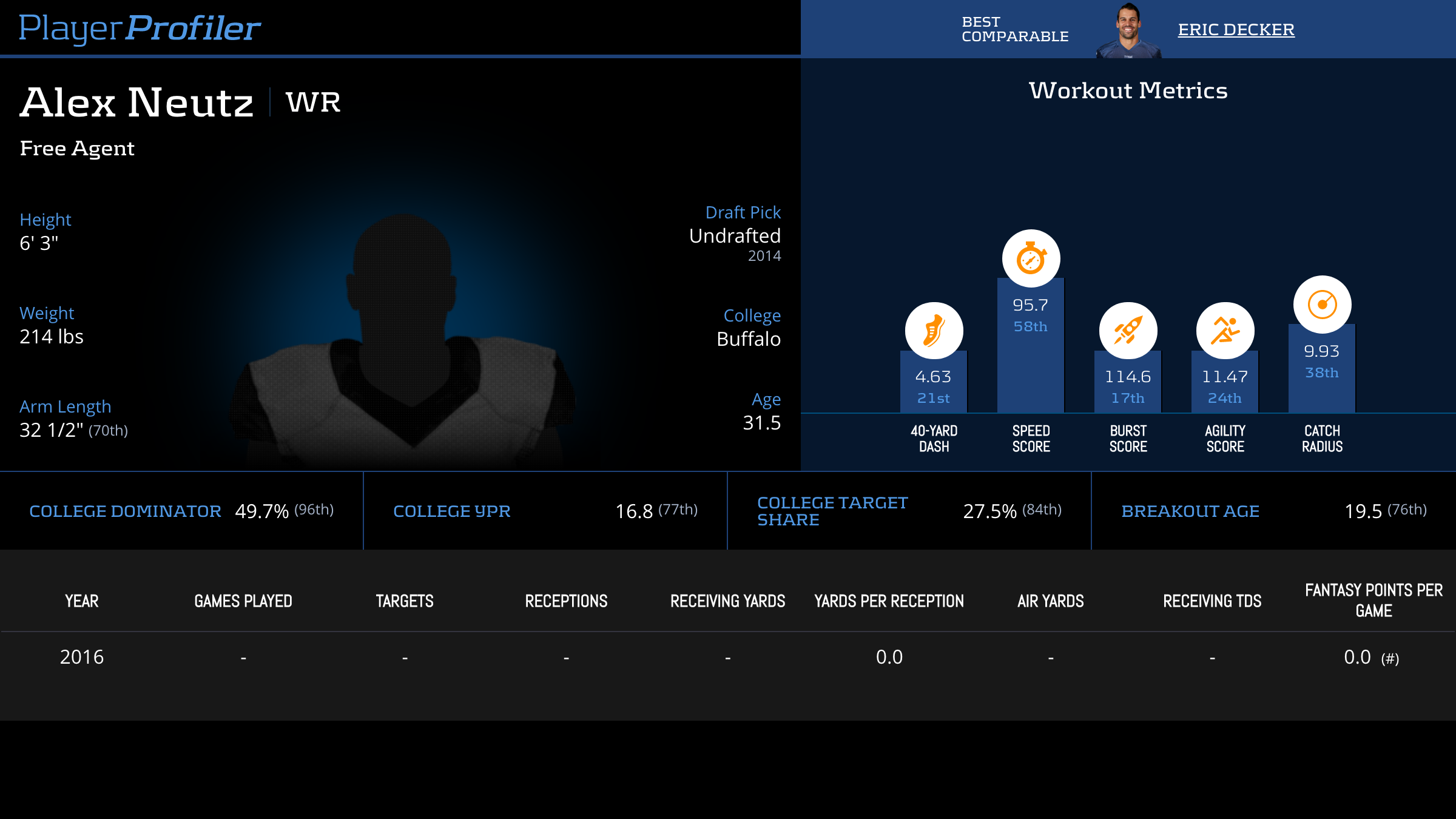 | Year Year | Games Games | Receptions Recs | Receiving Yards Rec Yds | Target Share Tgt Share | Catch Rate Catch Rate | Receiving Touchdowns Rec TDs | Special Teams Yards Special Teams | Age Age | School School |