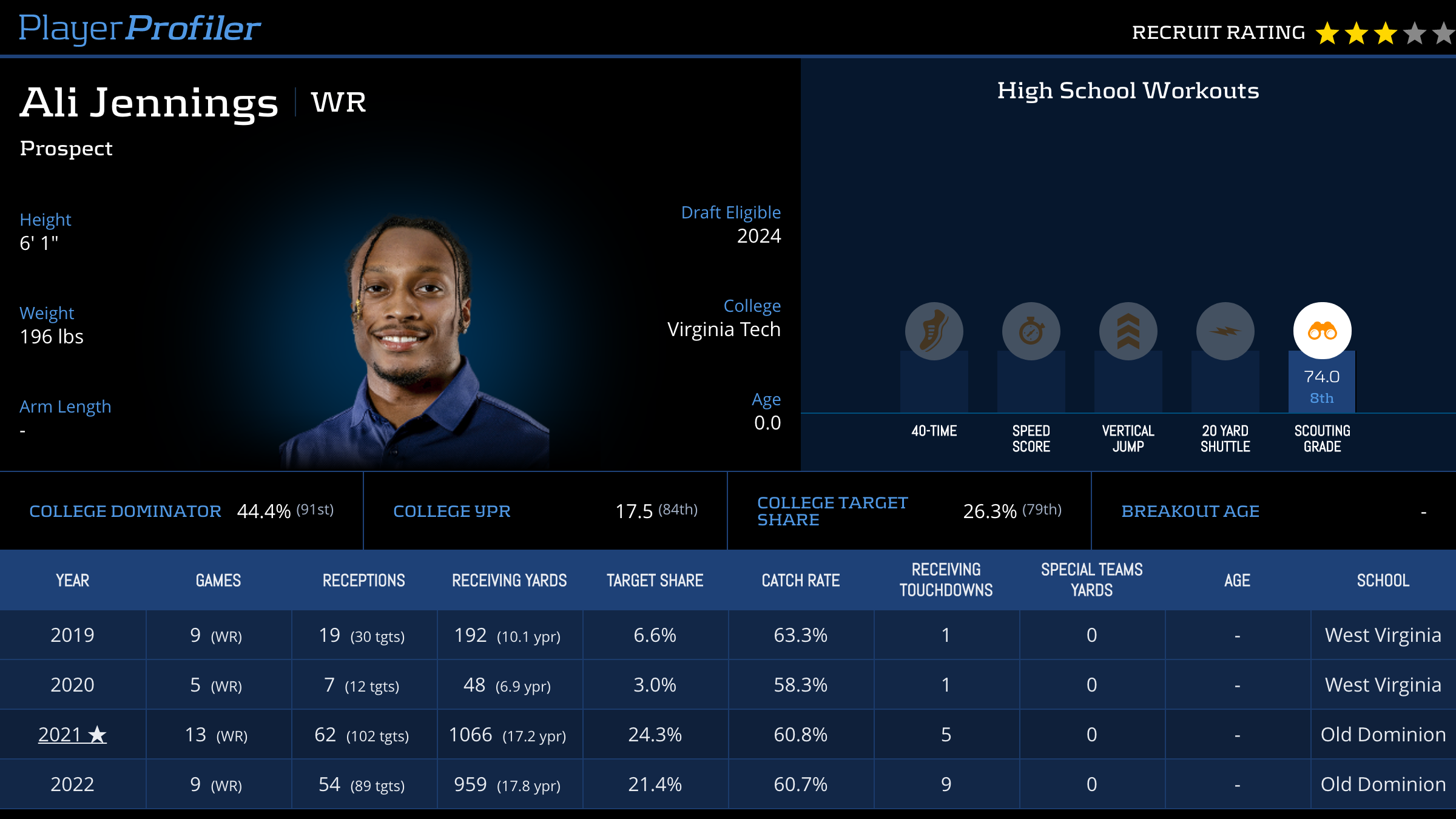 | Year Year | Games Games | Receptions Recs | Receiving Yards Rec Yds | Target Share Tgt Share | Catch Rate Catch Rate | Receiving Touchdowns Rec TDs | Special Teams Yards Special Teams | Age Age | School School |