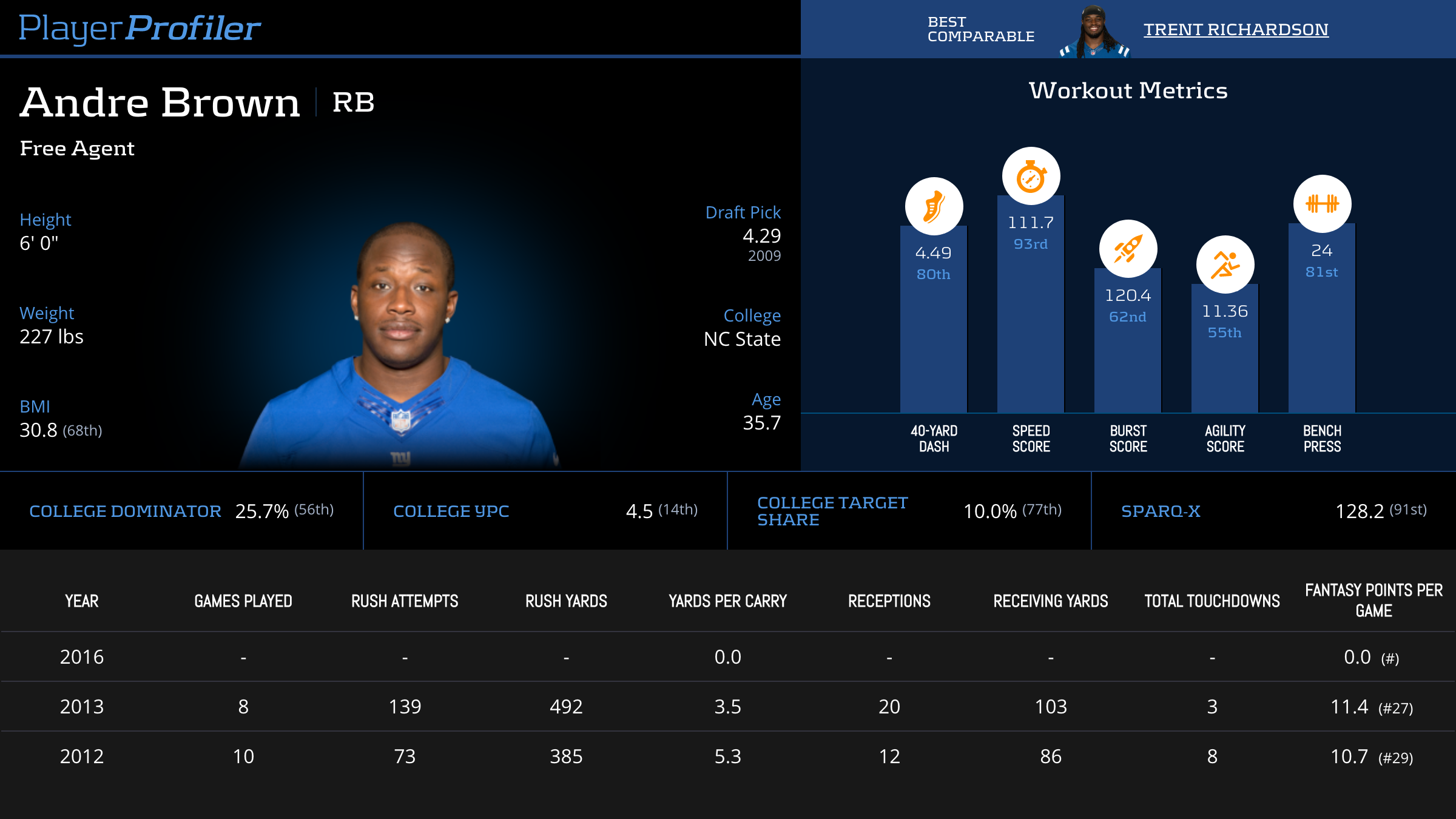 | Year Year | Games Games | Rush Attempts Rush Atts | Rushing Yards Rush Yrds | Total Touchdowns TDs | Receptions Rec | Receiving Yards Rec Yrds | Target Share Tgt Share | Age Age | School School |
