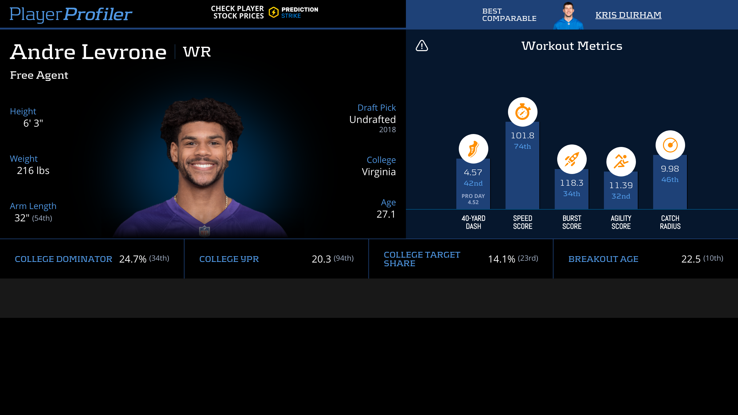 | Year Year | Games Games | Receptions Recs | Receiving Yards Rec Yds | Target Share Tgt Share | Catch Rate Catch Rate | Receiving Touchdowns Rec TDs | Special Teams Yards Special Teams | Age Age | School School |