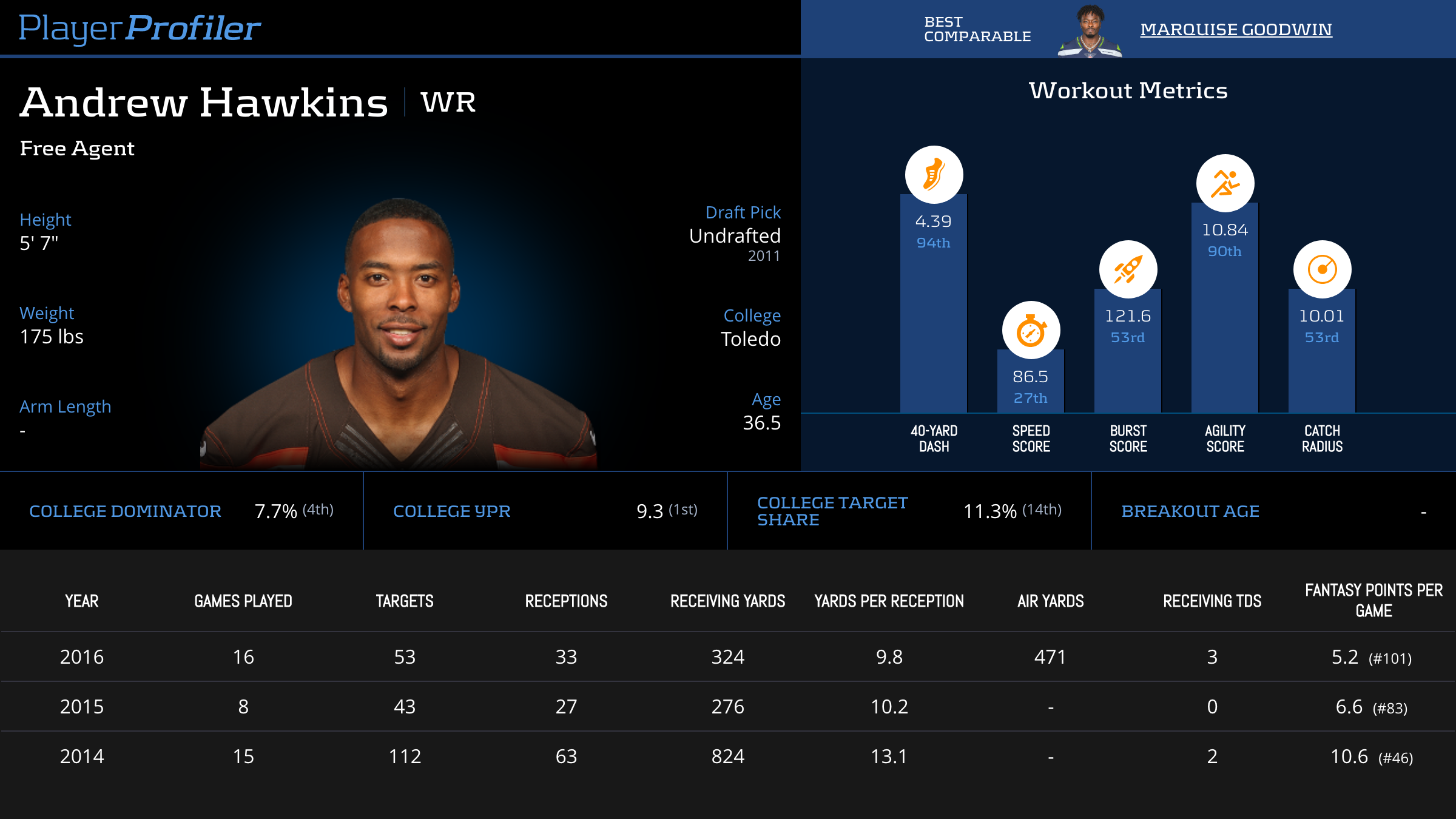 | Year Year | Games Games | Receptions Recs | Receiving Yards Rec Yds | Target Share Tgt Share | Catch Rate Catch Rate | Receiving Touchdowns Rec TDs | Special Teams Yards Special Teams | Age Age | School School |