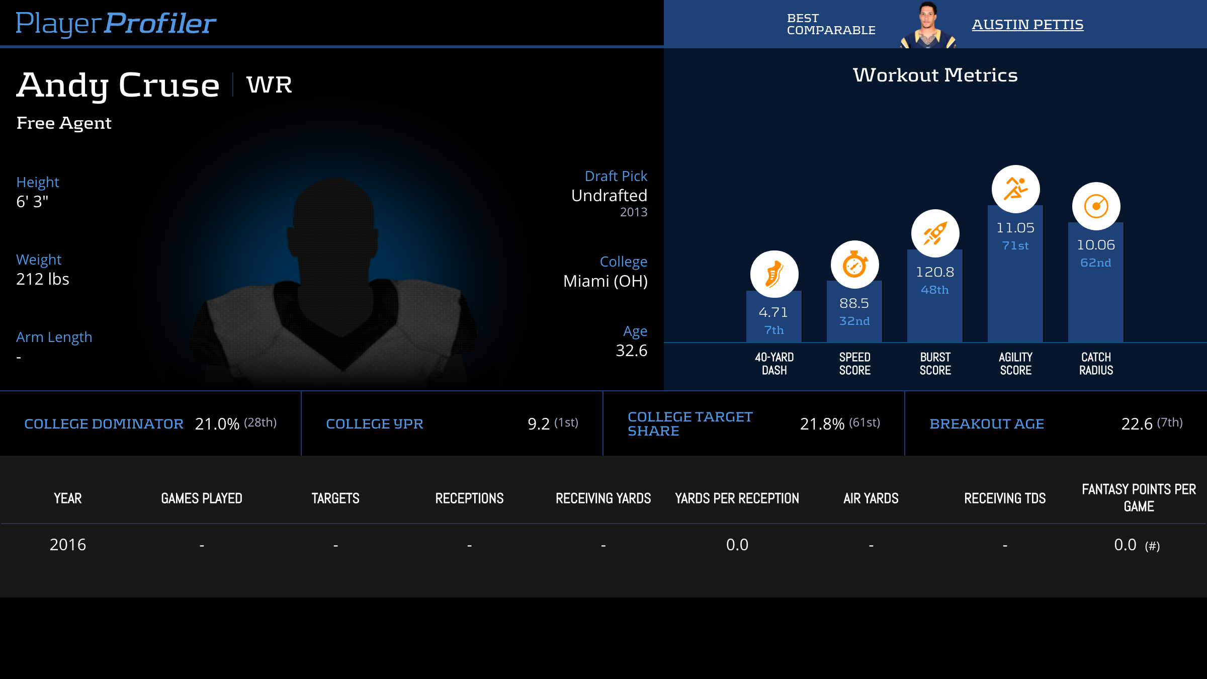 | Year Year | Games Games | Receptions Recs | Receiving Yards Rec Yds | Target Share Tgt Share | Catch Rate Catch Rate | Receiving Touchdowns Rec TDs | Special Teams Yards Special Teams | Age Age | School School |